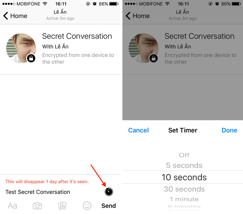 Khi bạn đã chọn người nhận xong, hãy nhập nội dung tin nhắn. Mặc định, tin nhắn sẽ không được thiết lập tự huỷ. Để gửi một tin nhắn tự huỷ, bạn cần chạm vào nút đồng hồ hẹn giờ nhỏ nằm bên trên biểu tượng Like hay nút Send. Chọn thời gian tin nhắn tồn tại, và sau đó nhấn nút Send để gửi nó. Bạn có thể đặt thời gian tự huỷ từ 5 giây cho đến 1 ngày.