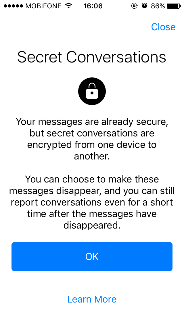 Sau thời gian thử nghiệm, mới đây Facebook đã bắt đầu triển khai tính năng gửi tin nhắn bí mật, tự huỷ đến người dùng Messenger. Nó được gọi là Secret Conversation và yêu cầu cả người nhận và người gửi phải sử dụng Messenger phiên bản mới nhất.