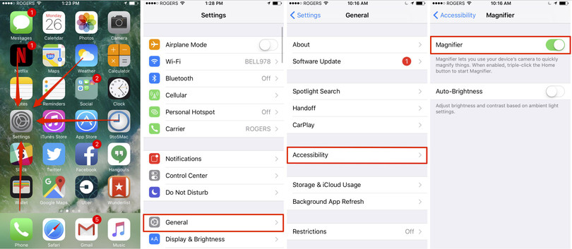 Tại giao diện chính bạn chọn vào phần Settings (cài đặt), tiếp đó chọn mục Accessibility (trợ năng) > Magnifier (kính lúp) và cuối cùng kích hoạt tính năng Magnifier.