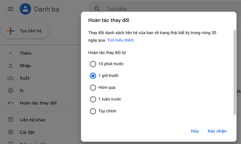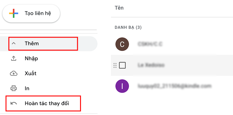 Bước 2: Trong giao diện Danh bạ, cạnh bên trái sẽ là các cài đặt, tùy chỉnh cho danh bạ. Chọn Thêm > Hoàn tác thay đổi hoặc More > Undo Change (nếu dùng tiếng Anh).