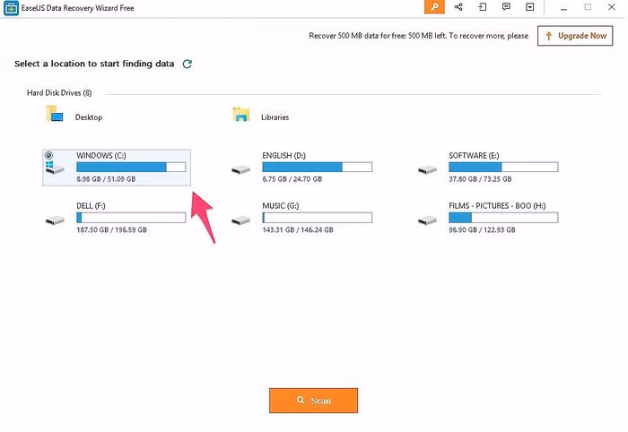 Khi hoàn tất, bạn hãy mở ứng dụng, chọn ổ đĩa bị mất dữ liệu và nhấn Scan. Nếu không thể khởi động máy tính, người dùng chỉ cần kết nối ổ cứng với một máy tính khác để phục hồi dữ liệu bị mất.