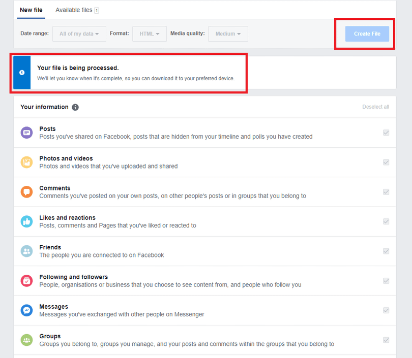 Bước 4: Bấm vào lựa chọn Download your information, tiếp đến chọn Messages sau đó bấm vào Create file.