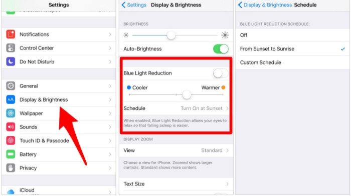 Lúc này bạn sẽ thấy xuất hiện một mục mới có tên Blue Light Reduction. Bạn có thể kích hoạt thủ công bằng cách kéo nút chuyển hình tròn màu trắng ở mục này sang bên phải (vị trí On). Apple cũng cho phép bạn lên lịch, hẹn giờ bật/tắt Night Shift. Nếu muốn làm điều này, bạn chọn vào mục Schedule. Tại đây, bạn có thể thiết lập để bật Night Shift lúc mặt trời lặn, và tắt nó khi mặt trời mọc (. Apple cũng cho phép bạn hẹn lịch bật tắt theo thời gian cụ thể do bạn chọn (Custom Schedule).