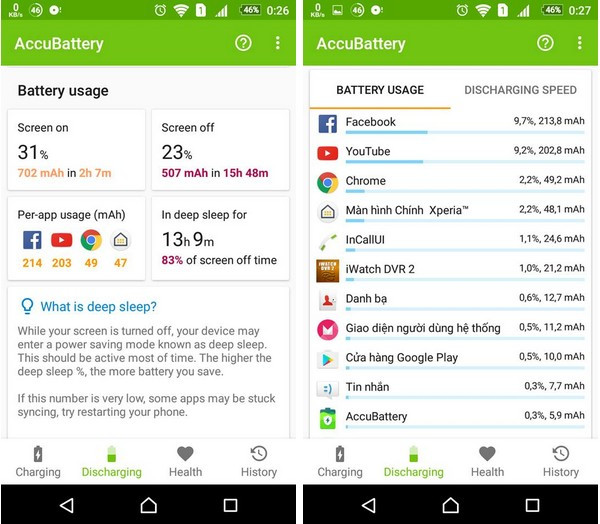 AccuBattery là ứng dụng quản lý pin không nên thiếu trên smartphone chạy Android. Ứng dụng không chỉ giúp hiển thị tình trạng của pin cũng như mức độ chai (nếu có) mà còn giúp quản lý quá trình sử dụng pin trên thiết bị, danh sách chi tiết và mức độ tiêu thụ pin của từng ứng dụng để biết được ứng dụng nào đang sử dụng pin nhiều nhất...