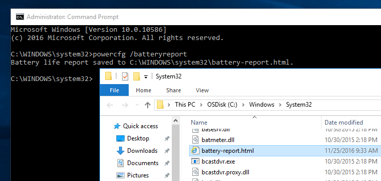 Để thực hiện, bạn nhấn tổ hợp phím Windows + X, chọn Command Prompt (Admin), gõ powercfg /batteryreport vào cửa sổ Command Prompt và nhấn phím Enter. Báo cáo pin được trích xuất và lưu tại địa chỉ C:\Windows\System32 với tên battery-report.