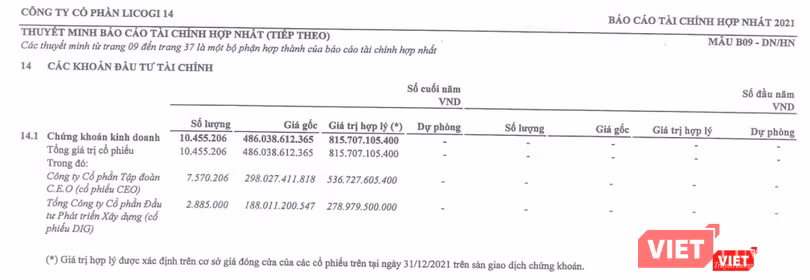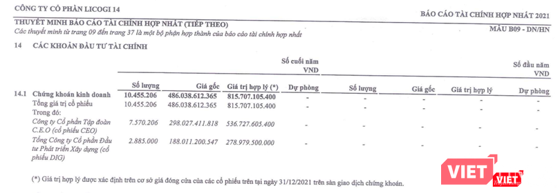 Tính đến cuối năm ngoái, số dư chứng khoán kinh doanh của L14 đạt 486 tỉ đồng (đầu năm 2021 không phát sinh khoản đầu tư này), với giá trị hợp lý lên tới 815,7 tỉ đồng.