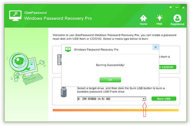 Sau khi cài và chạy ứng dụng, bạn cắm một USB trắng vào và chọn mục Burn USB để ứng dụng cài đặt trình gỡ bỏ mật khẩu vào USB.