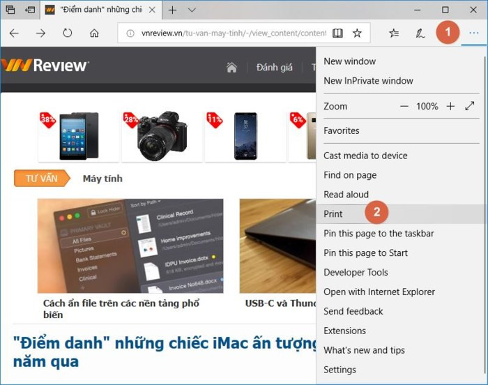 Mở trang web chứa bài viết bạn muốn in trên Edge, nhấn nút trình đơn hình dấu ba chấm ở phía trên góc phải của trình duyệt, và chọn tùy chọn Print. Hoặc bạn đơn giản chỉ cần nhấn phím tắt Ctrl + P.