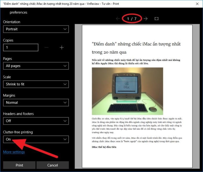 Và đây, sau khi bật chức năng Clutter-free printing, bạn có thể thấy trang in của chúng tôi chỉ còn lại nội dung chính bao gồm văn bản và hình ảnh, không có quảng cáo và các đối tượng không cần thiết khác. Thêm vào đó, trước khi bật chức năng này, kết quả in của chúng tôi có đến 11 trang. Sau khi bật nó, kết quả in bây giờ giảm xuống chỉ còn bảy trang.