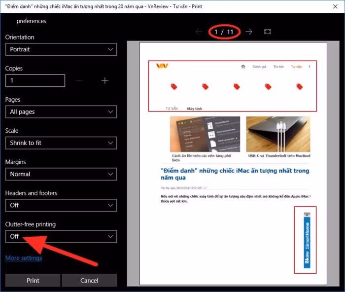 Cuộn xuống dưới một chút trên màn hình xem trước Print Preview, bấm lên trình đơn xổ xuống Clutter-free printing, và chọn On.