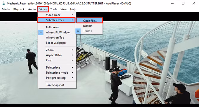 Ở phần tìm kiếm > Gõ tên phim cần tìm phụ đề vào để tìm và tải phụ đề phù hợp của phim về máy. Tại giao diện chương trình Ace Player HD > Video > Subtitles Track > Open File… > Tìm vị trí file phụ đề vừa tải về để load phụ đề cho phim.