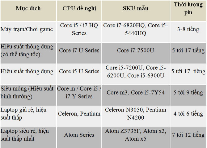 Dưới đây tạp chí LaptopMag đã lập biểu đồ phân loại các dòng CPU phù hợp với mục đích sử dụng của mỗi người dùng. Trong đó, máy trạm và chơi game luôn đòi hỏi dòng CPU hiệu suất cao. Trong khi đó, những dòng laptop giá rẻ, hiệu suất thấp thường sẽ dùng dòng CPU Celeron, Pentium và thậm chí là Atom cho dòng siêu rẻ.