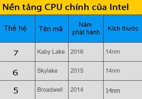 Chip Intel Core i hiện có 7 thế hệ. Thế hệ đầu có tên mã là Nehalem, thế hệ hai là Sandy Bridge, thế hệ ba là Ivy Bridge, thế hệ thứ tư là Haswell, thế hệ thứ năm là Broadwell, thế hệ thứ sáu là Skylake và thế hệ thứ bảy mới nhất là Kaby Lake.