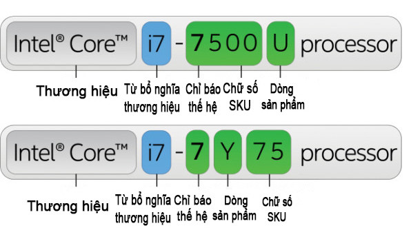Tên bộ xử lý = Thương hiệu (Intel Core) + Từ bổ nghĩa thương hiệu (i7) + Thế hệ (7) + SKU (500) + Dòng sản phẩm (U)