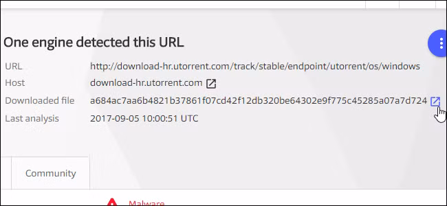 Nếu bạn quét một trang tải về thay vì đường dẫn tải file trực tiếp, bạn sẽ thấy đường dẫn Download file trên trang VirusTotal. Nhấn vào biểu tượng ở bên phải của Download file để xem các phân tích về file trang web đó tải về.