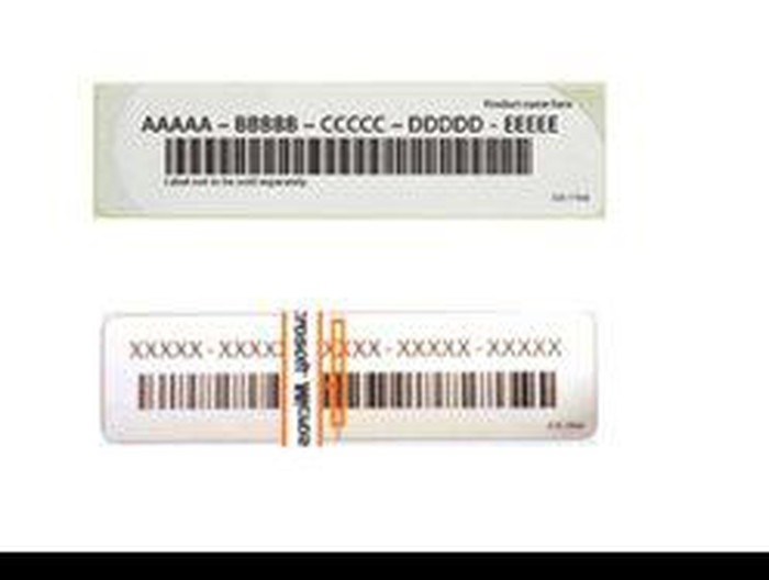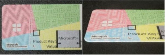 Ngoài mã vạch và mã khóa sản phẩm còn có một dòng in nhỏ ở cạnh trái và góc trên cùng bên phải. Khi kiểm tra chặt chẽ (có thể cần phải có kính lúp), tên MIC MICROSOFT ‘có thể được nhìn thấy bằng màu xanh lam ở phía bên trái và màu xanh lá cây ở phía bên phải. Nhãn khóa sản phẩm không được bán riêng, nó luôn đi kèm với phần mềm chính hãng.