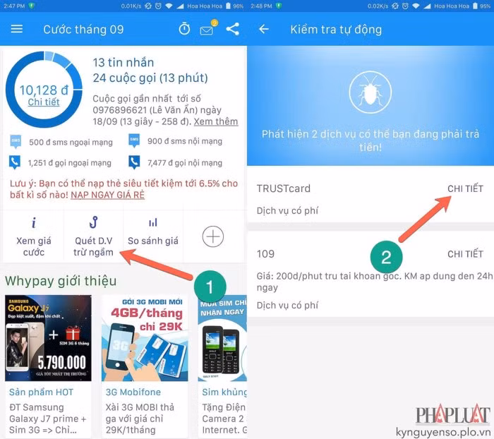 Để mọi thứ có thể khách quan và “minh bạch” hơn, bạn hãy cài đặt ứng dụng Whypay tại địa chỉ https://whypay.vn/ (tương thích các thiết bị Android và iOS). Khi hoàn tất, người dùng chỉ cần lựa chọn nhà mạng tương ứng và gói cước đang sử dụng. Tại giao diện chính, bạn hãy chạm vào mục Quét các D.V trừ ngầm > Kiểm tra dịch vụ VAS (giá trị gia tăng) và gửi tin nhắn theo cú pháp được soạn sẵn. Khi có kết quả, người dùng chỉ cần nhắn tin hủy bớt các dịch vụ không cần thiết để tránh bị mất tiền oan uổng.