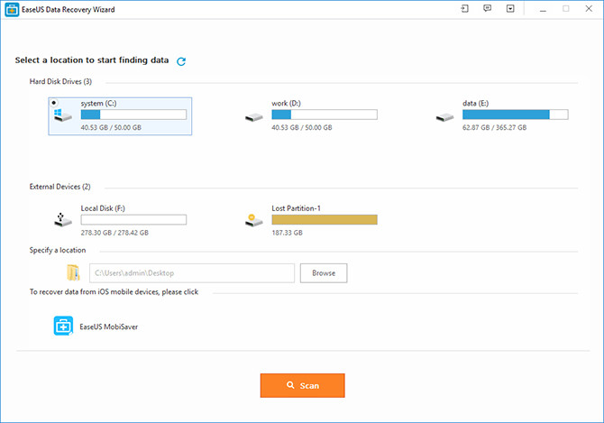 Từ giao diện chính của chương trình, bạn sẽ thấy các lựa chọn vị trí dữ liệu cần khôi phục là Specified location (tìm kiếm trong thư mục cụ thể), Existing partitions (tìm kiếm trong phân vùng ổ cứng), Lost partitions (tìm kiếm trong phân vùng đã mất). Sau khi chọn đúng trường hợp của mình, bạn nhấn nút Scan để chương trình bắt đầu quá trình tìm kiếm dữ liệu đã mất.