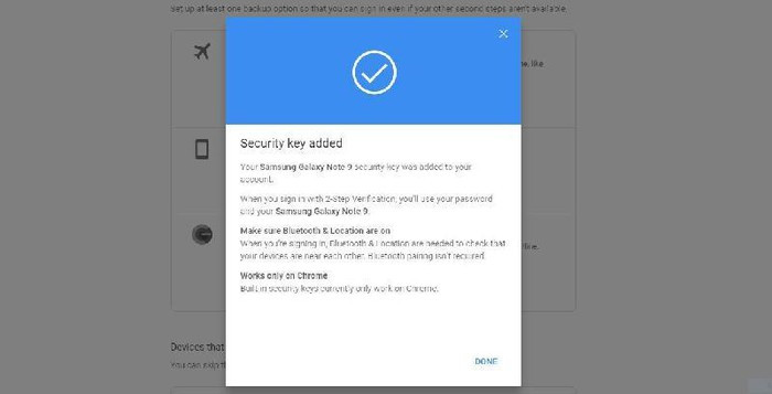 Khi hoàn thành việc cấu hình, trên màn hình điện thoại sẽ xuất hiện dòng chữ: Khóa bảo mật được thêm vào. Khóa bảo mật [tên điện thoại] đã được thêm vào tài khoản của bạn. Khi bạn đăng nhập bằng Xác minh 2 bước, bạn sẽ sử dụng mật khẩu và [tên điện thoại] của mình. Lần tới khi bạn tiến hành đăng nhập vào tài khoản của mình, bạn sẽ nhận được yêu cầu thực hiện trên smartphone .