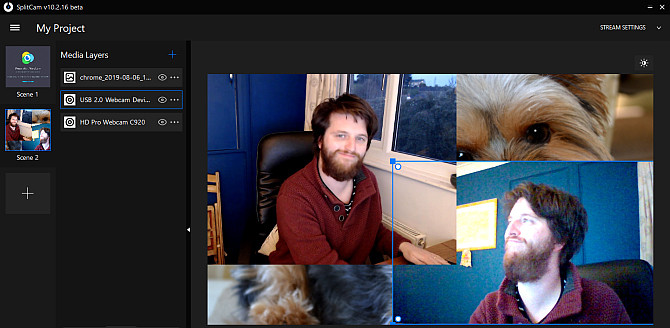 Sau khi cài đặt, bạn mở SplitCam, bấm nút hình dấu cộng, sau đó chọn các camera đầu vào, cũng như bố cục chúng theo ý muốn trong phần Media layers.