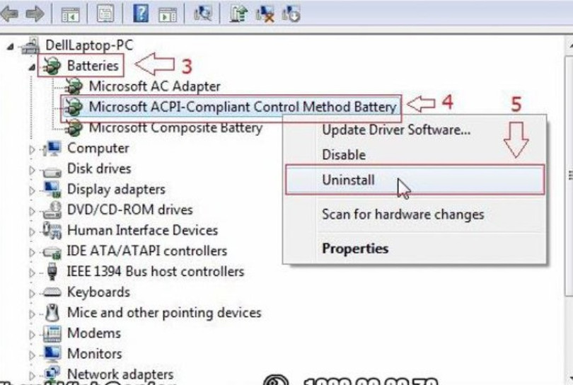 B2: Vào Control Panel -> Driver Manage -> chọn Batteries và ấn chuột phải vào Microsoft ACPICompliant Control Method Battery >> Uninstall.