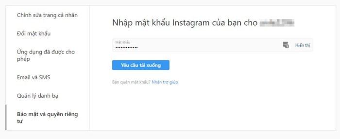 Nhập mật khẩu cho tài khoản Instagram để bắt đầu tạo yêu cầu tải về.