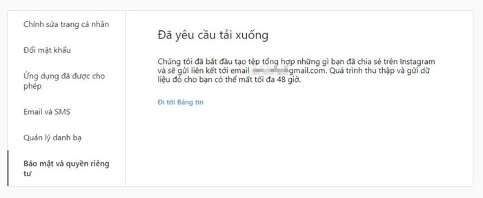 Instagram sẽ gửi email địa chỉ để bạn tải về dữ liệu của mình. Không giống như Facebook, Instagram lưu rất ít dữ liệu về bạn, chủ yếu là hình ảnh và video bạn đã tải lên.