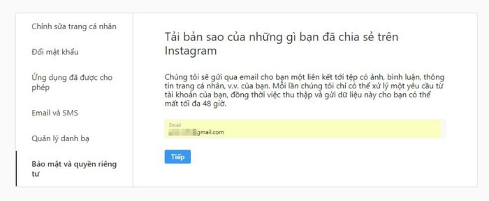 Nhập địa chỉ email để nhận địa chỉ tải dữ liệu về, bạn có thể nhập email bất kỳ, không nhất thiết phải là email đăng ký tài khoản Instagram.