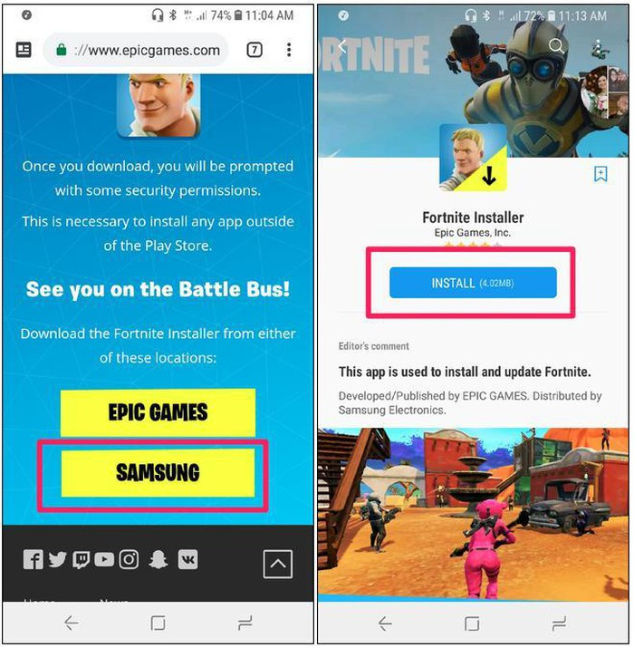 Samsung cũng sở hữu cửa hàng ứng dụng riêng mang tên Galaxy Apps. Trên thiết bị Samsung, truy cập https://www.epicgames.com/fortnite/en-US/mobile/android rồi chọn Samsung hoặc mở Galaxy Apps, tìm game Fornite. Bấm vào Install để tải về.