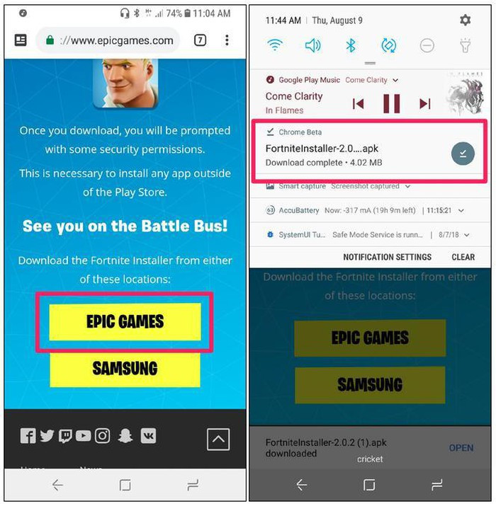 Bạn có thể cài đặt Fornite về điện thoại Android thông qua website chính thức của Epic Games. Điều cần làm đầu tiên là tải Fornite Launcher bằng cách truy cập liên kết https://www.epicgames.com/fortnite/en-US/mobile/android trên thiết bị, bấm vào nút Epic. Sau khi tải xong, kéo cửa sổ thông báo xuống rồi chạm vào.