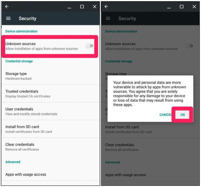 Với Android 7.0 Nougat trở xuống, khi bấm vào Settings, nó sẽ dẫn bạn đến trình đơn Security, tại đây gạt công tắc ở dòng Unknown Sources và bấm vào OK khi cảnh báo khác hiện ra.