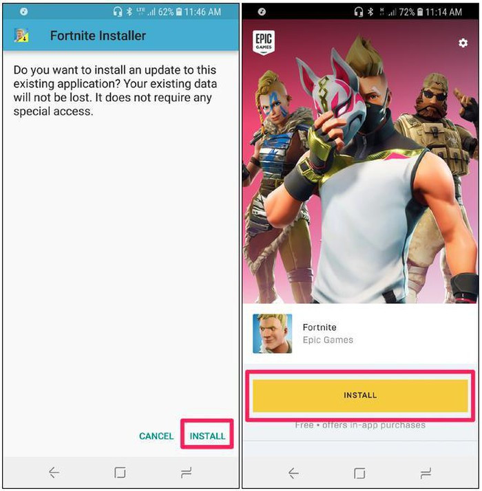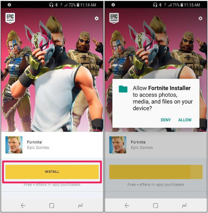 Sau khi tải xong, quá trình cài đặt sẽ bắt đầu. Bấm vào nút Install để tải về game Fornite và bấm vào Allow để cho phép Fornite Installer truy cập ảnh, đa phương tiện và tập tin trên thiết bị.