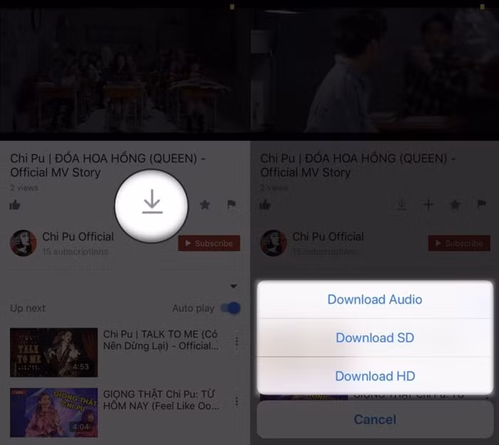 Sau khi đăng nhập thành công, quay lại video và chọn lại nút Tải về. Ngay lập tức người dùng sẽ có 3 tùy chọn bao gồm: Download Audio (Tải về file nhạc .m4a), Download SD (Tải về file video chất lượng SD), và Download HD (Tải về file video chất lượng HD).