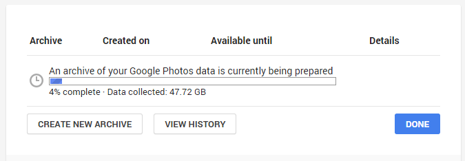 Bạn có thể đóng trình duyệt web và quá trình nén và tạo file vẫn sẽ tiếp diễn. Bạn luôn luôn có thể quay lại trang Google Takeout và sau đó nhấp vào Manage Archives để xem tiến độ công việc.