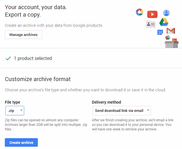 Mặc định, bạn sẽ nhận được một email với một đường dẫn tải file về một khi file nén đã được tạo hoàn tất. Nếu muốn, bạn cũng có thể lưu trực tiếp file nén vào Google Drive, Dropbox hay OneDrive. Hãy nhấp nút Create Archive và quá trình tạo file sẽ bắt đầu.