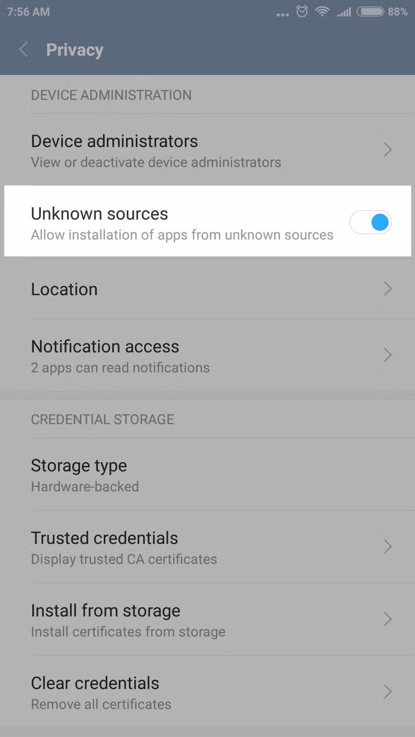 Lưu ý: Bạn cần bật chế độ Unknown sources (Không rõ nguồn gốc) trên thiết bị của bạn. Để thực hiện, bạn truy cập vào Settings (Cài đặt) > Security (Bảo mật) và sau đó bật công tắt tại mục Unknown sources (Không rõ nguồn gốc).