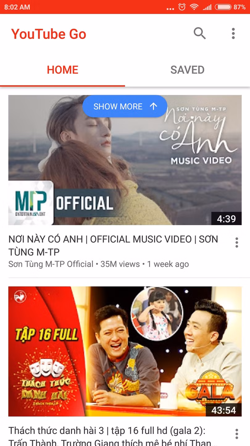 Mở YouTube Go và bạn sẽ thấy giao diện không thể đơn giản hơn với chỉ hai thẻ Home và Saved ở trên cùng. Dưới thẻ Home, bạn sẽ tìm thấy các video bạn có thể tải về dựa trên thói quen xem video của bạn. Bạn cũng có thể tìm kiếm các video khác sử dụng nút hình kính lúp ở phía trên góc phải.