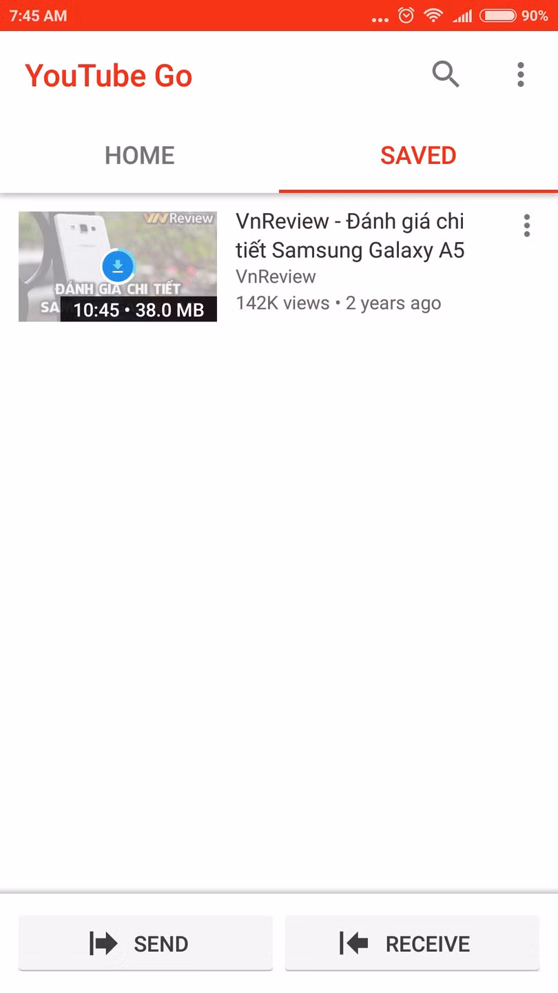 Các video sau khi tải về sẽ được lưu ở thẻ Saved. Ngoài ra, với YouTube Go, bạn còn có thể Send (Gửi) hoặc Receive (Nhận) video đến/từ bạn bè thông qua tên thiết bị.