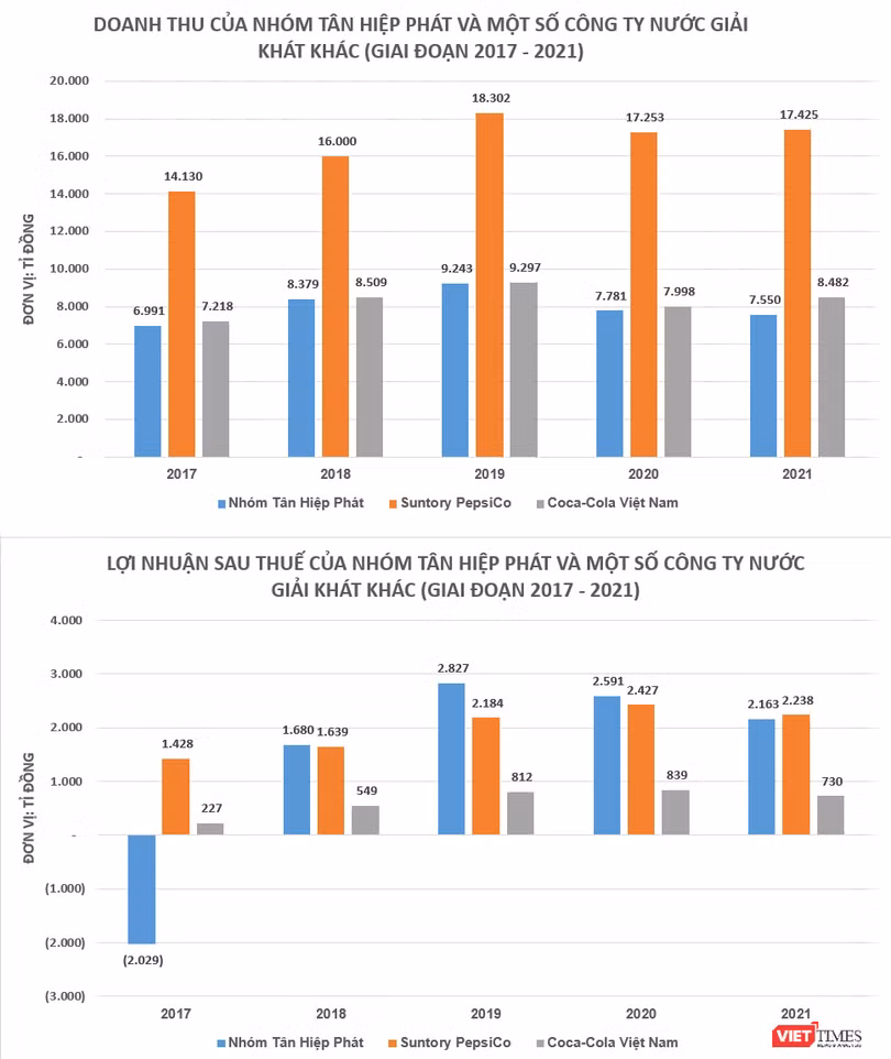 Theo tính toán của VietTimes, năm 2021, với 100 đồng doanh thu, Tân Hiệp Phát thu về tới 28 đồng lợi nhuận, thì Suntory PepsiCo Việt Nam hay Coca-Cola Việt Nam chỉ thu về từ 8-12 đồng lợi nhuận.