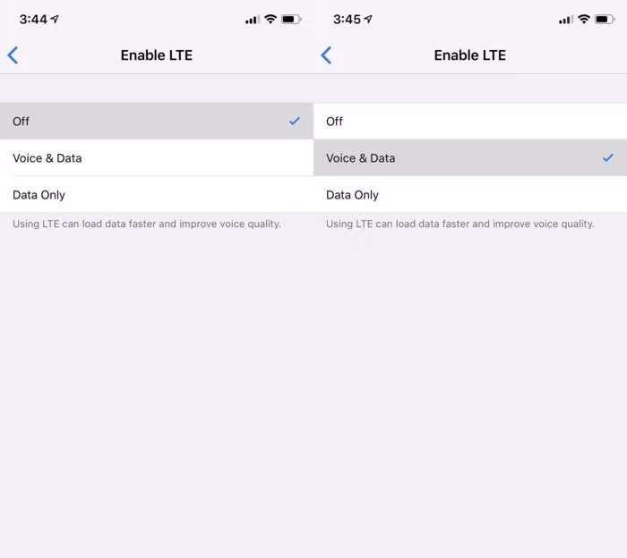 Sau đó bạn đợi khoảng 30 giây và chọn lại Voice & Data (thoại & dữ liệu) hoặc Data Only (chỉ dữ liệu). Đối với Android, người dùng chỉ cần tắt/bật dữ liệu di động hoặc chuyển máy sang Airplane mode (chế độ máy bay).