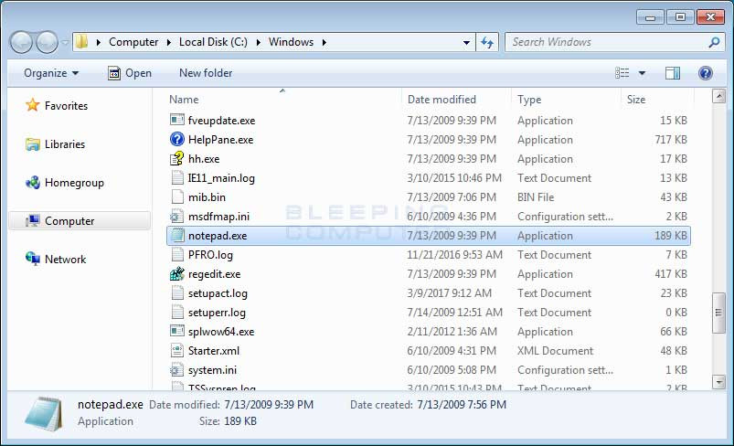 Tiếp theo, hãy mở thư mục C:\Windows trên máy tính và kéo xuống để tìm chương trình notepad.exe.