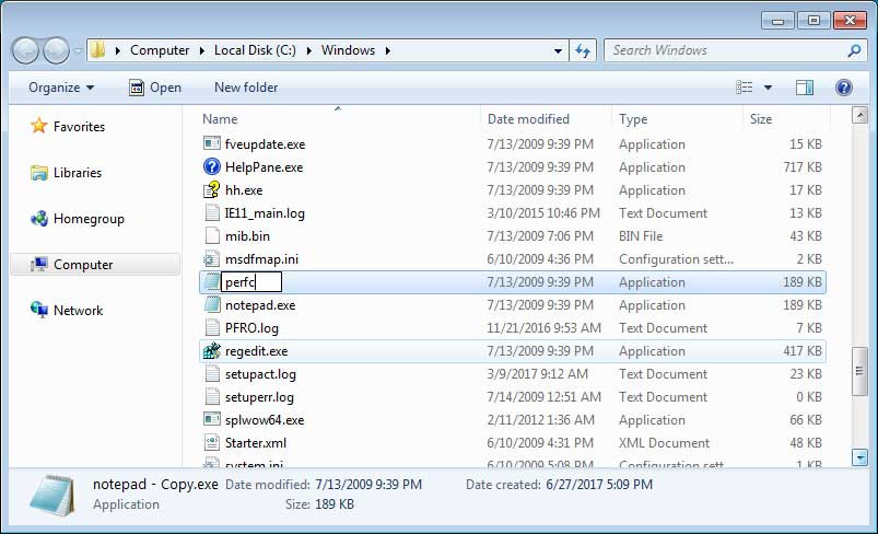 Sau khi dán, một tập tin có tên là notepad – Copy.exe sẽ xuất hiện. Nhấn chuột trái vào tập tin đó, bấm F2 và thay đổi tên của tập tin thành Perfc như dưới đây.