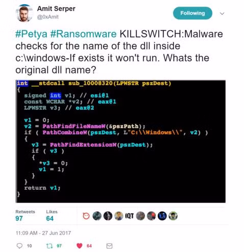 Trong quá trình phân tích, chuyên gia Amit Serper đã nhận thấy ransomware NotPetya sẽ cố gắng tìm kiếm một tập tin trong thư mục C:\Windows. Nếu phát hiện tập tin đã có sẵn trên ổ đĩa, NotPetya sẽ tự động ngừng mã hóa. Phát hiện của Serper đã được nhiều chuyên gia tới từ các hãng bảo mật hàng đầu như PT Security, TrustedSec và Emsisoft xác nhận.