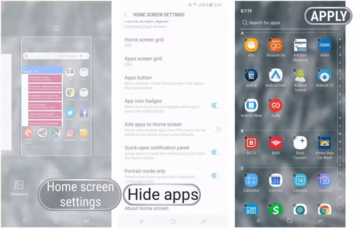 Tuy nhiên, bạn có thể ẩn bớt các ứng dụng không cần thiết này khỏi màn hình để đỡ ngứa mắt. Đầu tiên, bạn hãy nhấn im tại một vùng trống trên màn hình chính, chọn Home screen settings > Hide apps, đánh dấu vào các ứng dụng cần ẩn rồi nhấn Apply. Bất cứ khi nào bạn muốn đưa ứng dụng trở lại, hãy thực hiện tương tự các bước trên và bỏ ẩn.