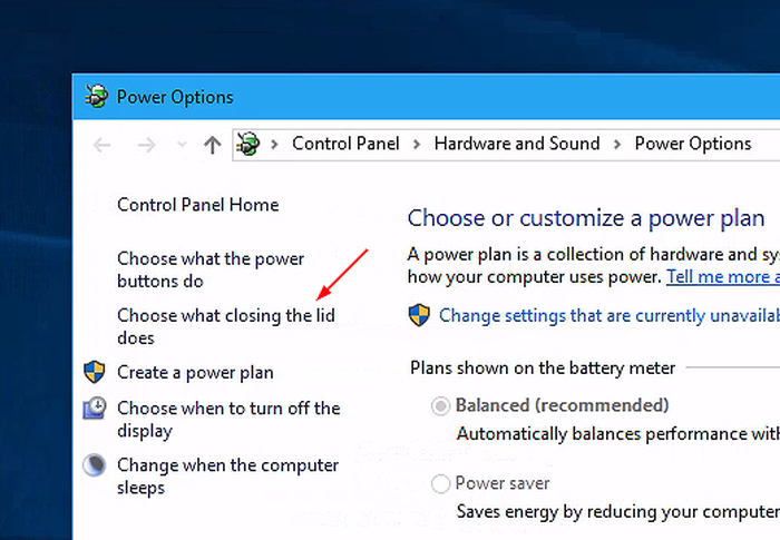 Trong cửa sổ tiếp theo, bạn hãy chọn Choose what closing the lid does. Tại đây, người dùng chỉ cần thiết lập là Shutdown cho cả hai chế độ On battery (nguồn pin) và Plugged in (nguồn sạc) khi gập màn hình (When I close the lid). Ngoài ra, còn một số lựa chọn khác khi nhấn nút nguồn (When I press power button) hoặc nhấn nút Sleep (When I press the sleep button).