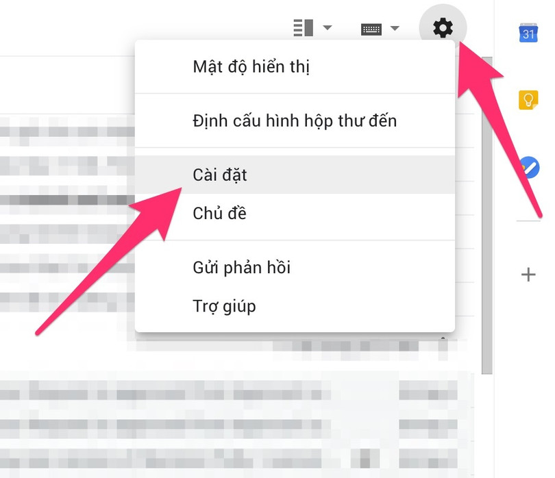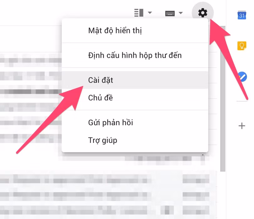 Đầu tiên, bạn bấm lên nút hình bánh răng ở phía trên góc phải của cửa sổ Gmail, rồi chọn tùy chọn Settings (Cài đặt) từ trình đơn xổ xuống.