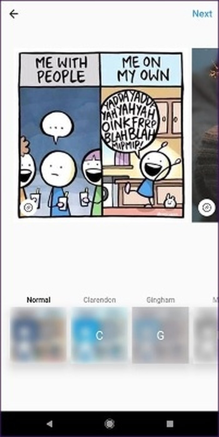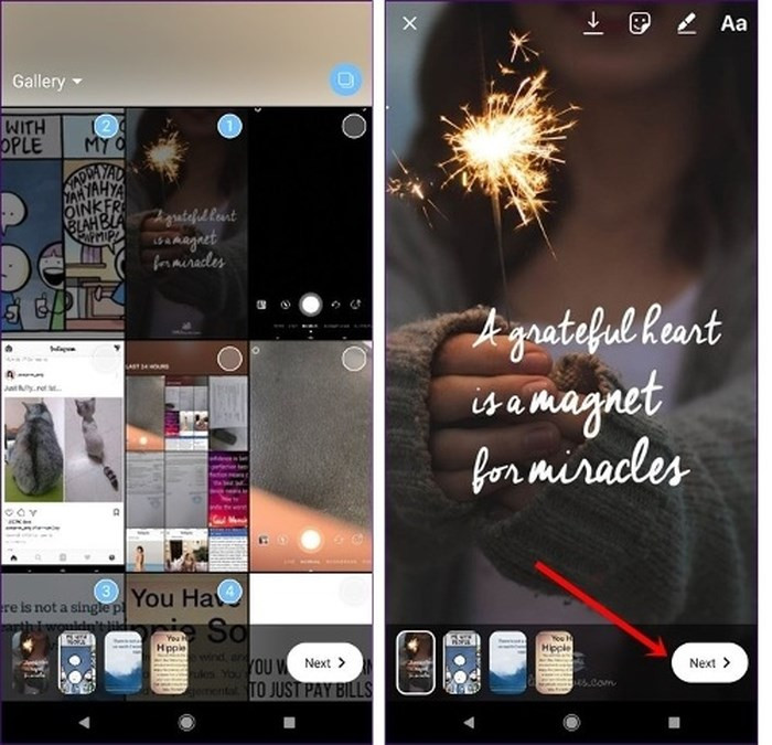 Bước 4 : Sau khi chọn ảnh, bấm vào nút Next ở dưới cùng. Bây giờ, bạn có thể thêm hình dán, văn bản và những tính năng sáng tạo khác trên mỗi ảnh một cách độc lập. Khi album câu chuyện đã sẵn sàng, hãy nhấn vào nút Next ở dưới cùng.