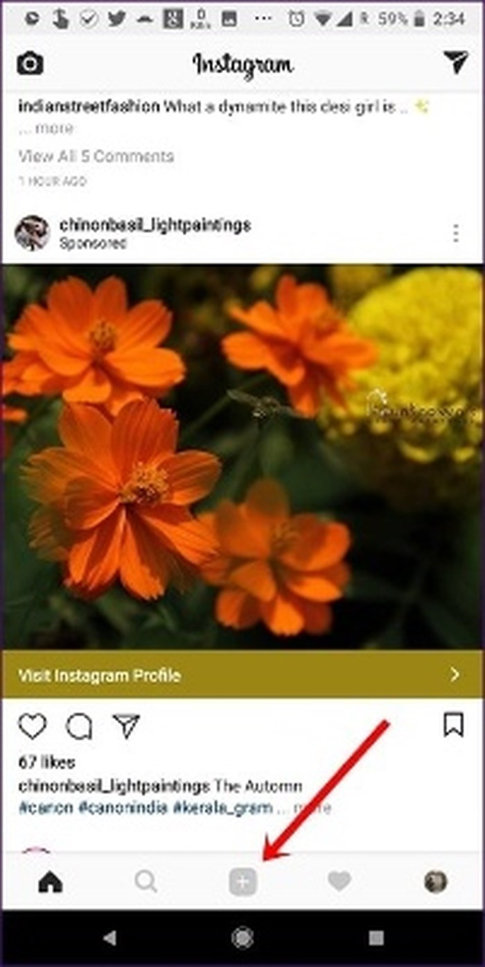 Bước 1: Mở ứng dụng Instagram trên điện thoại của bạn. Trên màn hình chính, chạm vào biểu tượng Add ở dưới cùng màn hình.