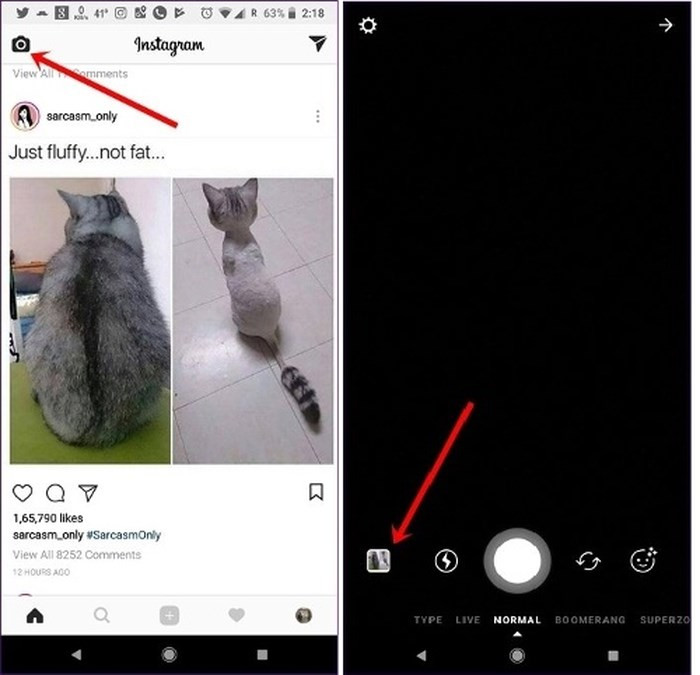 Bước 2 : Khởi chạy ứng dụng Instagram. Nhấn vào biểu tượng camera ở góc trên bên trái để mở màn hình Story. Trên màn hình này, bấm vào biểu tượng Gallery ở phía dưới cùng.