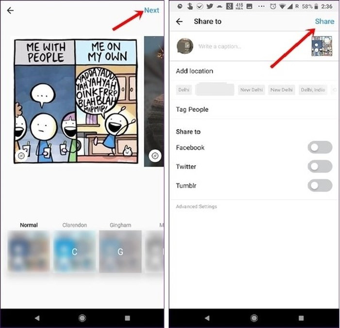 Bước 5: Khi đã hài lòng với album ảnh/video bài đăng của mình, hãy nhấn vào nút Next ở góc trên cùng. Sau đó, đưa ra một chú thích hoặc gắn thẻ những người bạn muốn chia sẻ, cuối cùng nhấn nút Share.